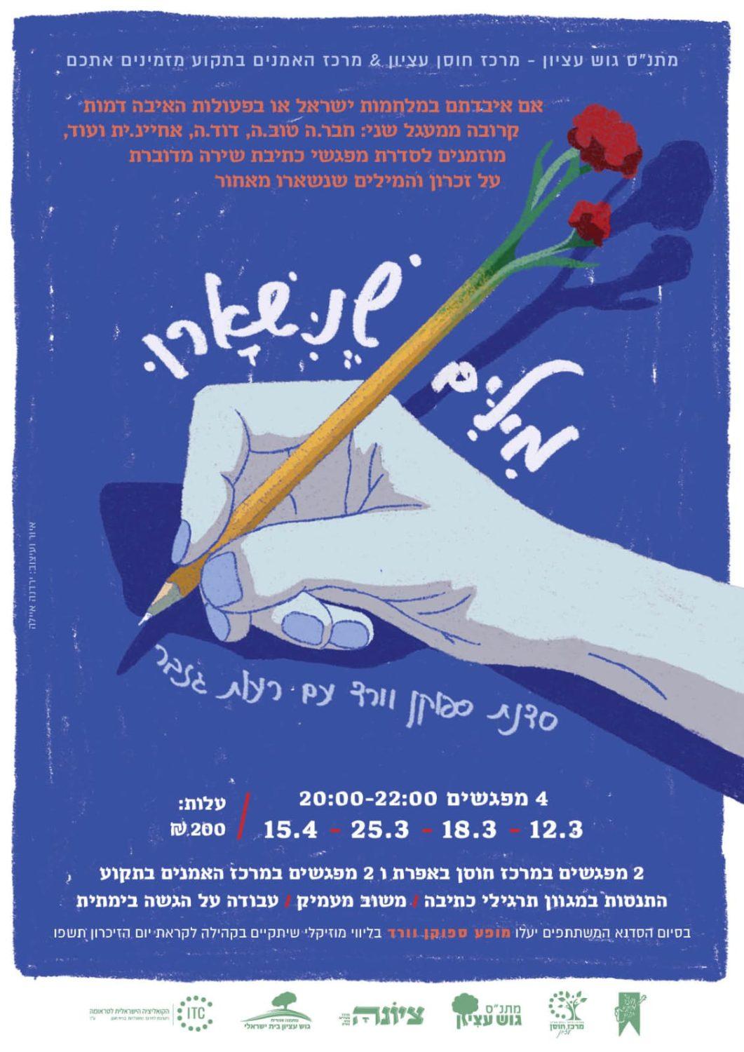 מתנ"ס גוש עציון מרכז חוסן עציון ומרכז האמנים בתקוע מזמין אתכם, חברים ובני משפחה מהמעגל השני והשלישי של השכול ש"עמדתם" בזמן השבעה ועוד לא הצלחתם להגיד את הכל