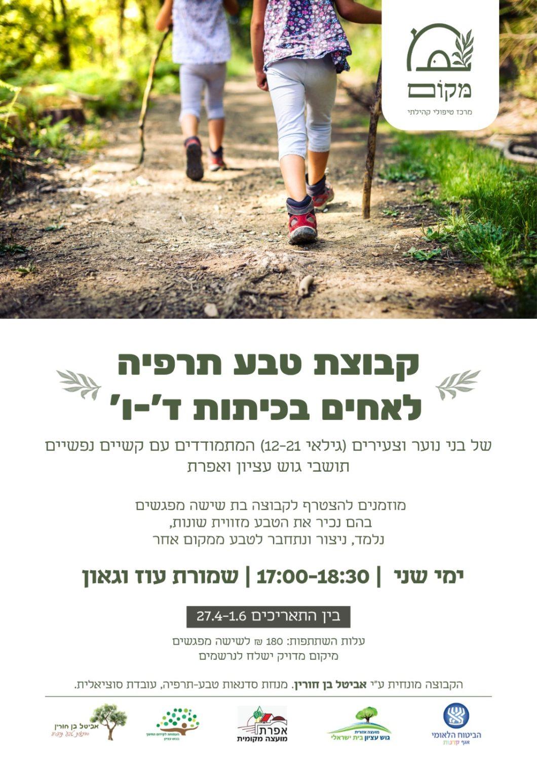 מרכז 'מקום' מזמין אחים בכיתות ד'-ו' (שיש להם אח/ות עם קושי נפשי בגילאי 12-21) לקבוצת טבע-תרפיה ייחודית.
